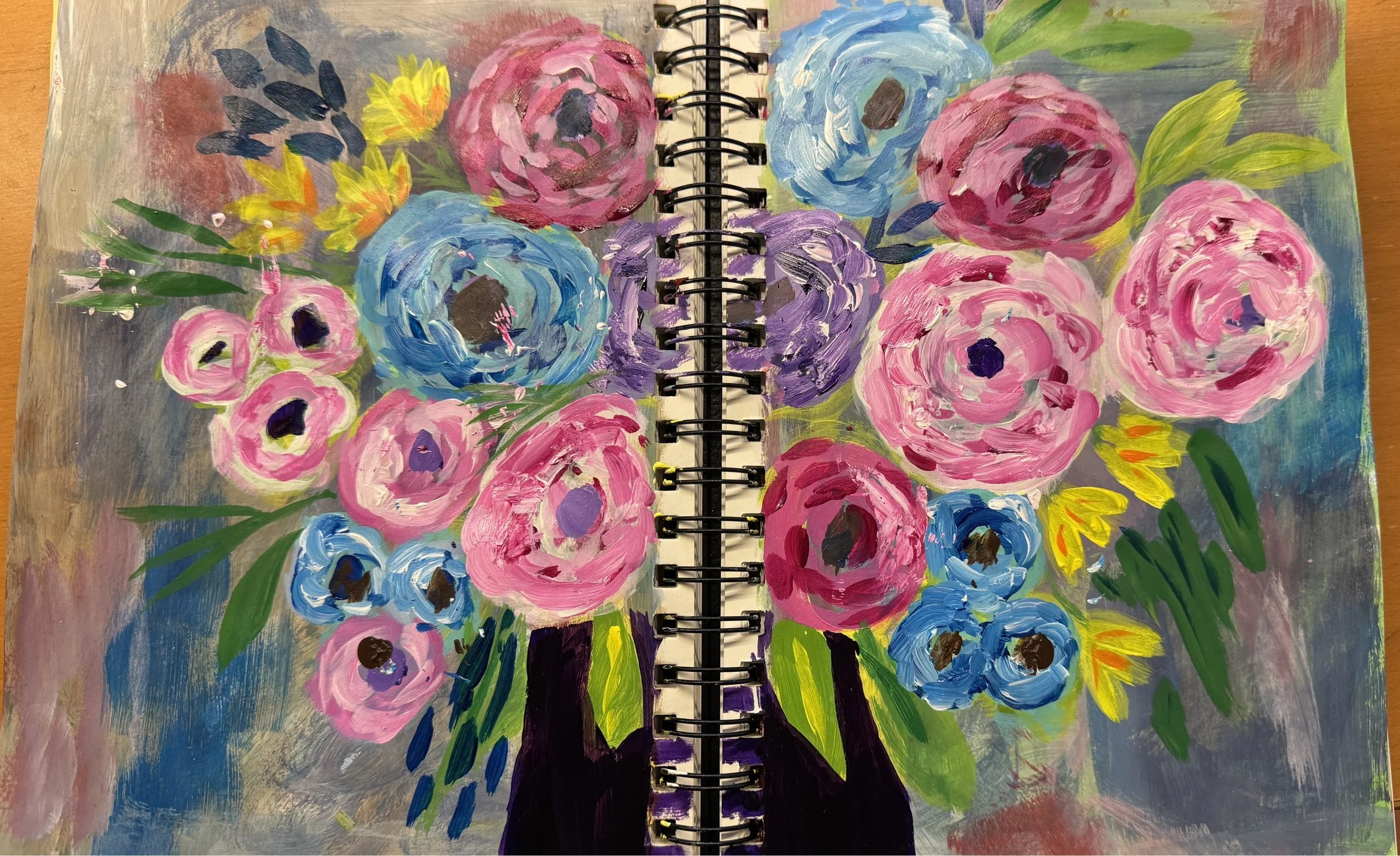 I recently started painting with gouaches and acrylics and did a two-page floral arrangement. I’m pretty proud of it given it was the first time I tried something like this. But I’ve just now realized that it’s missing something (or a couple of somethings). I think it’s time to go back and add some hidden surprises.