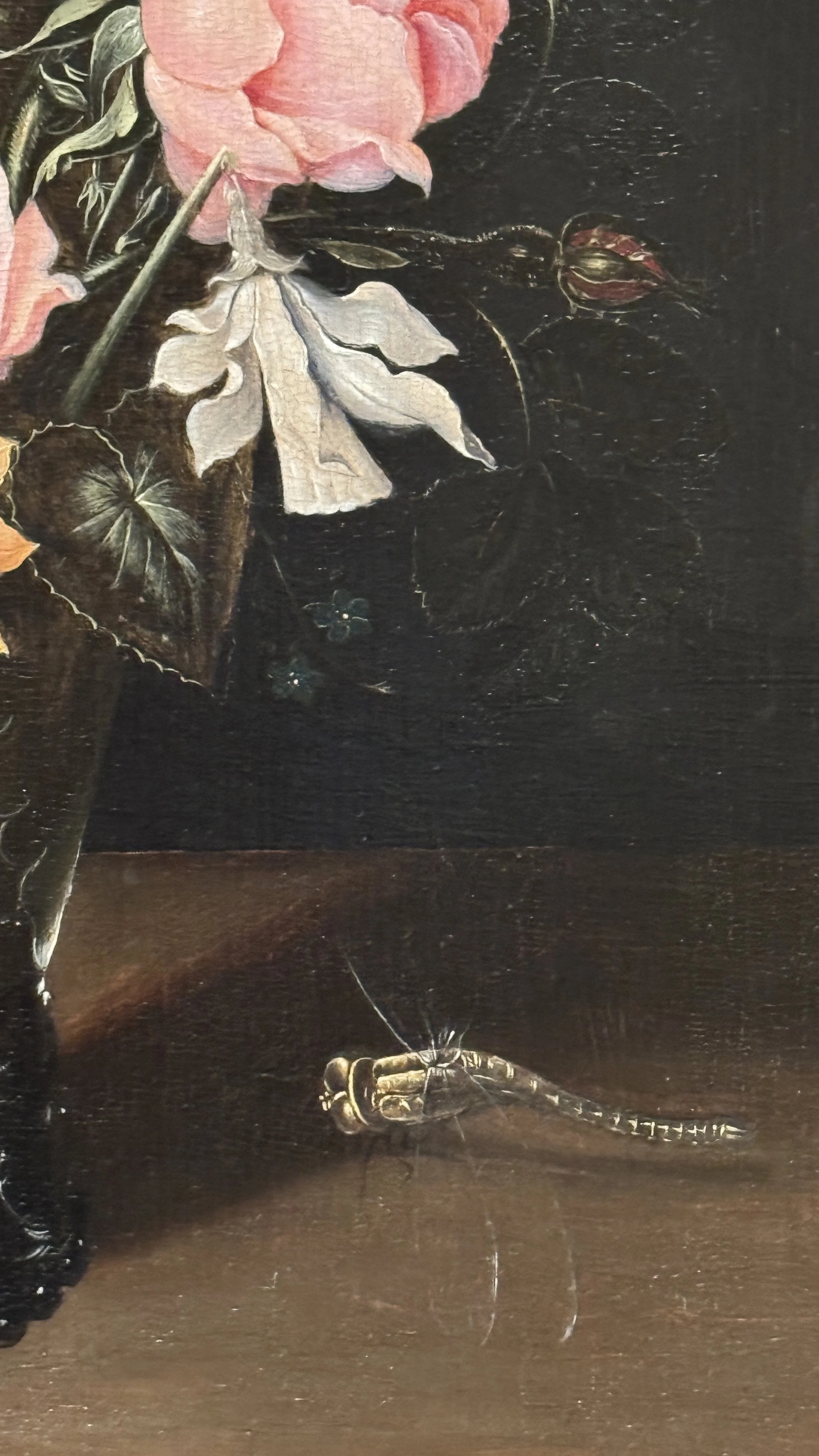 Once I moved closer to look at this incredible vase that really does look like Lumière, I saw the beetle. I almost missed the little gal. She looked like some petals or leaves that had dropped from the arrangement. The flowers are pretty but they are the least interesting part of this painting to me.